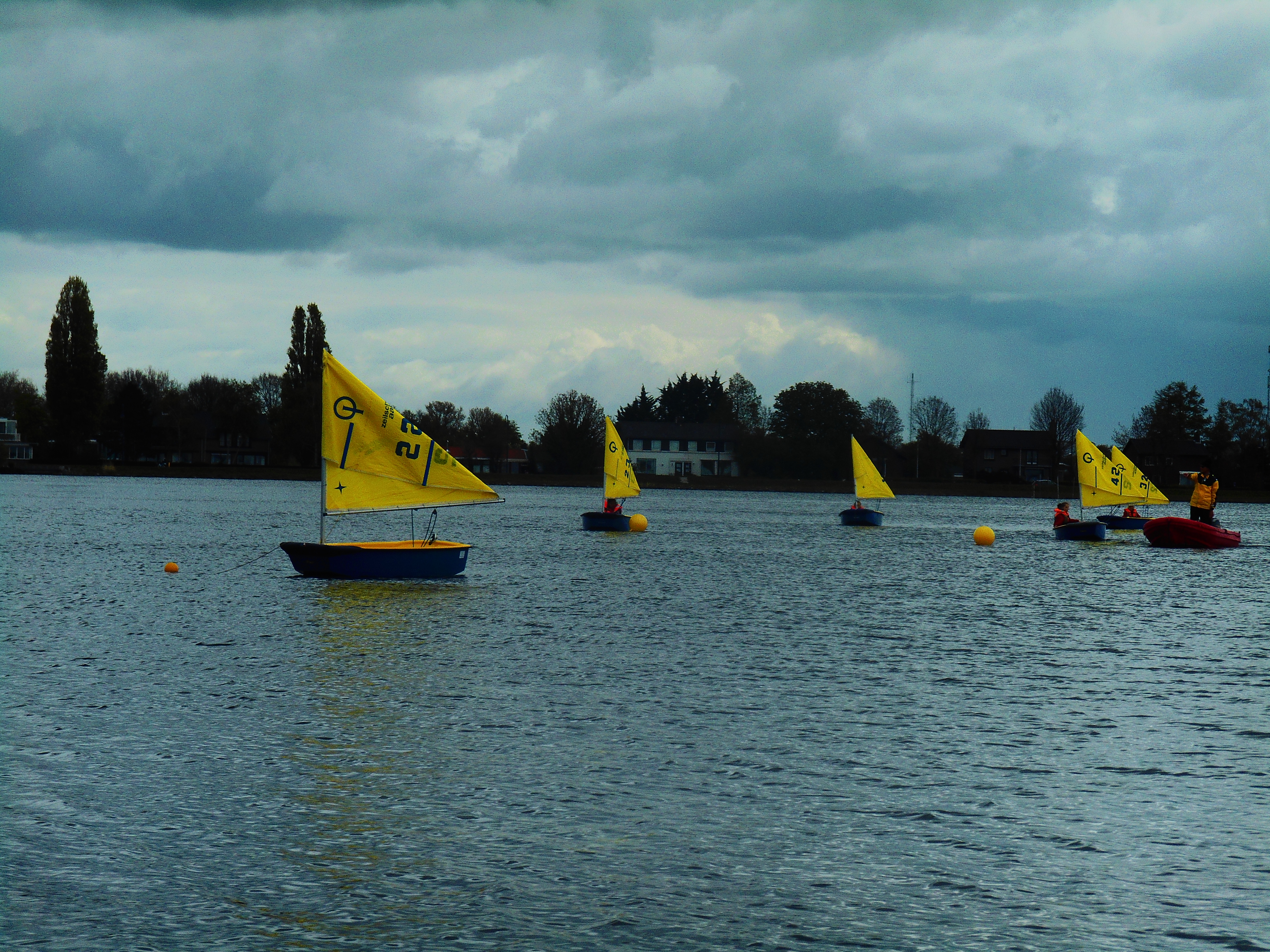 We voeren langs de Nieuwe Meer , dan over de Kleine Poel richting doorvaart de Kleine Brug. Op de Grote Poel waren jonge zeilertjes in hun bootjes met gele zeiltjes aan het oefenen…!